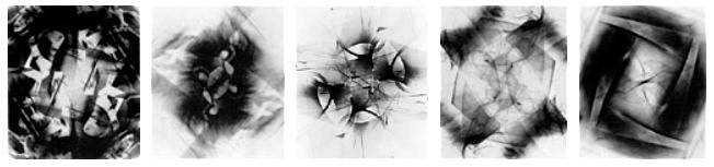 Zum näheren Verständnis erwähne ich, dass ich bei meinen kameralosen Fotografien nie Folien verwendete oder die Bildbühne eines Vergrößerungsapparates. Seitliches Licht (Taschenlampen) durchdringt handelsübliche Gläser, welches Lichtreflexionen, Lichtspuren, aber auch Schatten erzeugt. Die Fotogramme, die in sich gespiegelt sind, sind Teilbelichtungen auf Zonen des Papiers bis zur Mitte hin, das zwei‐ bis viermal gedreht wird. Durch dieses Prinzip generieren Lichtformen mit teilweise geometrischer Struktur und sich überlagernden Lichtspuren und Schattenformen, die den Eindruck sich überschneidender Dimensionen entstehen. lassen. Der „Gekippte Kreis“ ist ein durch vierfach Drehung entstandenes Fotogramm. Das Fotogramm zur Ausstellung in Ungarn, „Shadow“ Hungarian Museum of Photography, Kecskemét enstand ohne Drehung, ebenso die drei Fotogramme Kunstszene Saar, „Visionen 2000“.